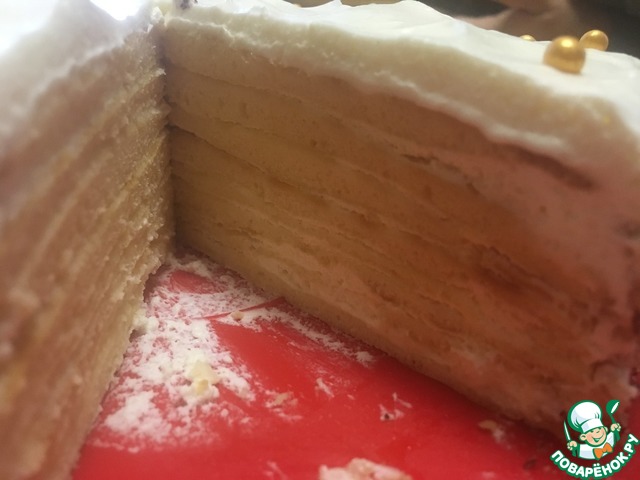 Тортик вкусненький.нежненький.Получилось восемь коржей.коржи какие то влажноватые за.что очень переживала.но как оказалось напрасно крема мне не хватило поэтому верх торта покрыла просто взбитыми сливками.бока обсыпала орешками.