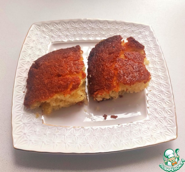 Очень вкусный результат. Боялась, что манка будет скрипеть на зубах, но нет. Пирог получился очень нежный, лишь по краям хрустящий. Готовила точно по рецепту, но без куркумы. Пекла 35 минут при 180 градусах. Не обошлось без проблем. Нет, нет, с пирогом все отлично, это мои ручки-крючки нечаянно уронили форму с пирогом и он поломался. Товарный вид исчез, но не вкус. Ничего, все равно полила все сиропом и из формы ели просто ложкой. Ну очень вкусно!!!!