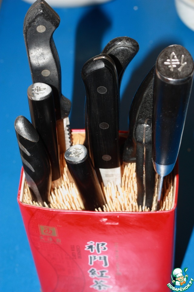 Из большой банки из под чая и 900 бамбуковых шпажек получилась подставка для ножей.
