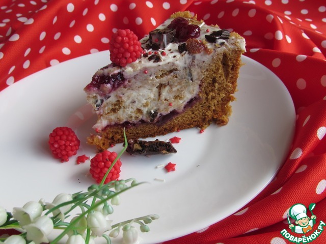 Великолепный вышел медовик, воздушный, ароматный! Выпекала в мультиварке режим «Выпечка» 75 мин. при t=160 С. В начинку добавила сметаны побольше примерно 800 гр., кусочки медовика, внутри корзинку смазала джемом из черной смородины, украсила тертым шоколадом, кондитерской посыпкой и ягодками малинки. Спасибо, Людочка!