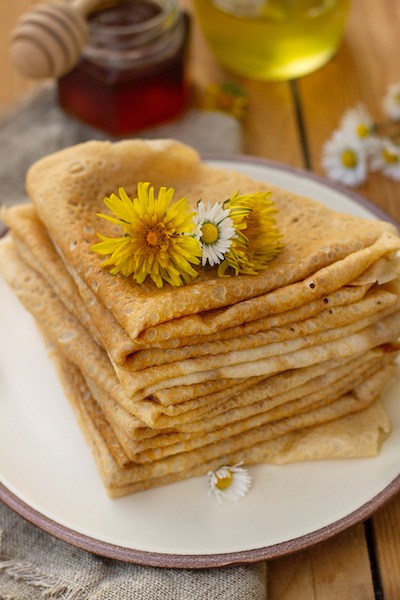 Пробовала сделать постные блины. Но у меня они не получились. Пришлось всё-таки добавить яйцо. Жёлтый цветок в качестве украшения.