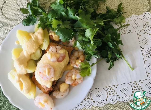 Кета -гриль с креветочно-сливочным соусом .