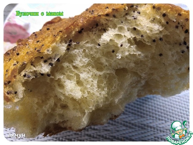 Заинтересовала красивая формовка и решила испечь, тем более что с маком, наверное, и не пекла ничего, ну может пару раз. Все делала точно по рецепту. Получилось 14 булочек. Ждала такой же красоты, но булочки таааак в духовке расперло (уж извините, другого слова и не подобрать), что получился сплошной пирог. Сами булочки вкусные, в меру сладкие, нежные, прям невесомые. Понравились, но вот теперь думаю: надо, наверное, их выпекать на двух противнях или… Буду думать.