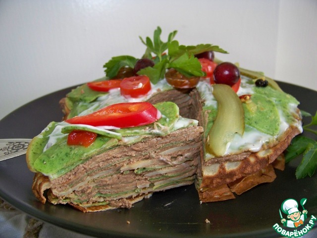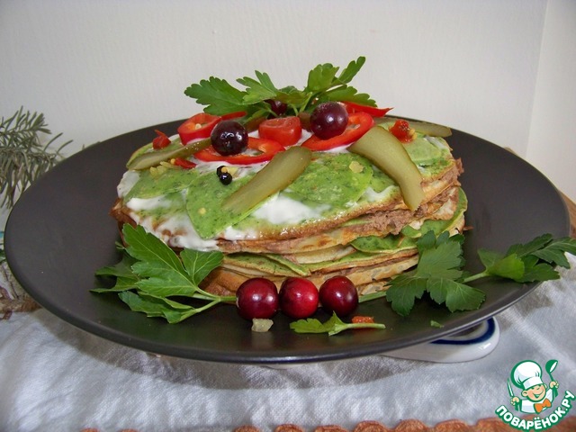 Готовила блины 2-х видов - с куриным мясом и с добавлением шпината. Получился 2-х цветный торт. Промазывала слои майонезом с зеленью! Превосходный вкус торта получился, просто объедение! Все члены семьи были сыты и довольные!