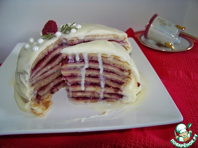 Масленница давным-давно прошла, но я всё равно приготовила блинный торт для себя, любительницы блинов, и для сына, знающего толк в блинах! Готовила пюре из клюквы и малины (аромат обалденный!) Покрывала торт ганашем из белого шоколада (черного в наличии, на тот момент, не было). Вкус торта-божественный! Миллион благодарностей автору чудо-торта Светлане, за доставленное удовольствие!