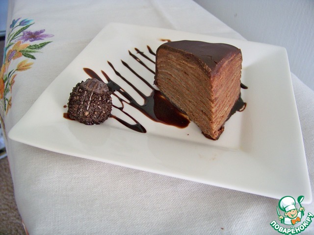 Готовила блинное тесто с добавлением шоколадного соуса, остальное строго по рецепту. Шикарный торт получился! Оформила иначе, по-своему, крем+шоколад, без трюфелей, ("не дожили" они до момента оформления торта). Ах, какое вкусное чаепитие было... c приятным послевкусием! Миллион раз спасибо, Кристиночка!