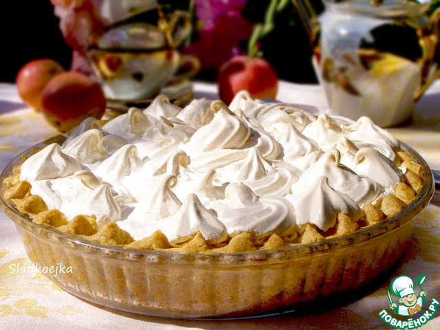 Этот пирог уже совсем иного рода: сложносочиненный, с игрой вкусов, построенной на контрасте. Представьте, что на сладкой рассыпчатой песочной основе лежит мягкая кисло-сладкая яблочная начинка, а сверху все прикрыто нежной и воздушной как облако меренгой…
