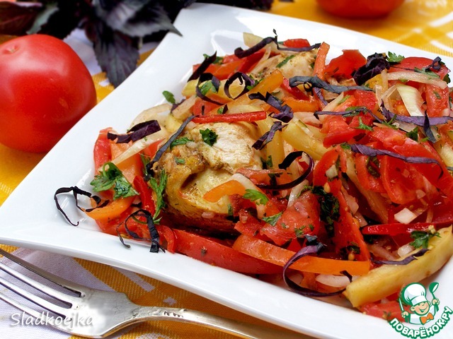 Очень вкусное блюдо, во всех смыслах замечательный вариант для жаркой летней погоды: и красочно по-летнему, и овощей много, и стоять у плиты не надо! Блюдо яркое и сочное, пряное и пикантное, а какие ароматы - голова кругом! Приготовила утром, а к вечеру курочка отлично пропиталась. Мы любим и овощи, и пряные травы, поэтому, нам блюдо очень понравилось!