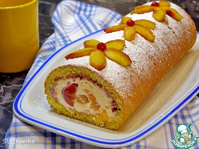 Я давно хотела испечь этот рулет и, наконец-то, свершилось! У меня он с персиками и малиновым вареньем. Очень удачный рецепт бисквитного теста: готовый корж эластичный, его легко свернуть в рулет, ничего не ломается и не трескается, не прилипает к пергаменту. В начинку из взбитых сливок я добавила сахарную пудру, загуститель не понадобился, так как сливки у меня были густые – с рынка. Рулет получился очень нежный и вкусный!