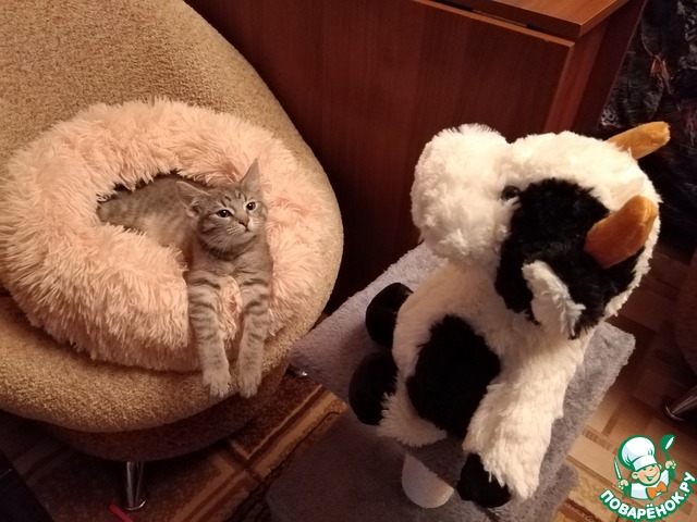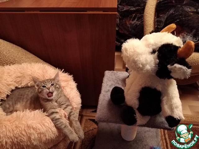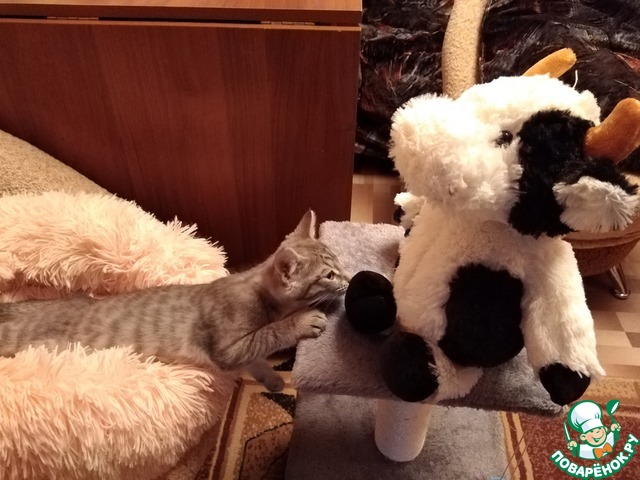 Сегодня сделала несколько фото. Знакомство Кукси с игрушечным бычком после сна дневного.