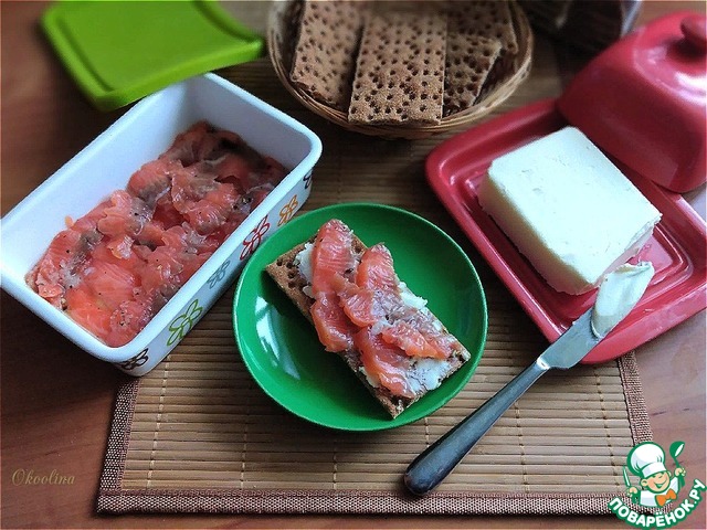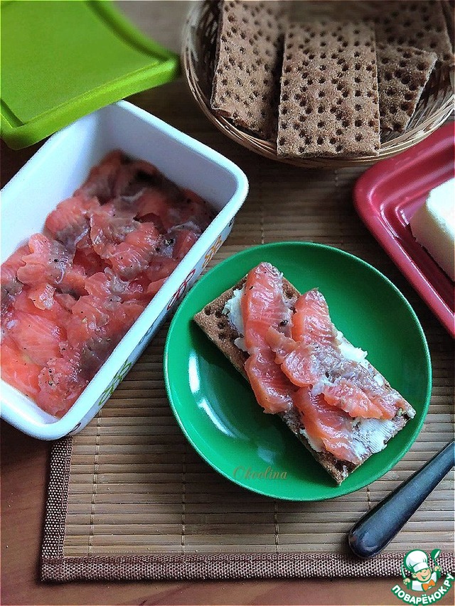 Рецепт оставила в кулинарной книге. Сегодня он мне очень пригодился. Я купила кусок лосося 250 г. Решила засолить. Всё делала строго по рецепту. Осталась очень довольна результатом. Ела рыбу через 2 часа, намазав хлебец сливочным маслом. Бутерброд к чаю. Алкоголь совершенно не чувствуется, всё по-моему вкусу! Конечно буду делать всегда!