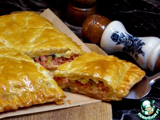 Пирог получился очень даже вкусным, несмотря, что экспресс-вариант! Все делается быстро и просто, если в морозилке есть готовое тесто. Этот рецепт - отличная палочка-выручалочка, когда надо что-то быстро подать на стол. Начинку, думаю, можно менять по желанию, но мне и эта (с колбасой) понравилась.