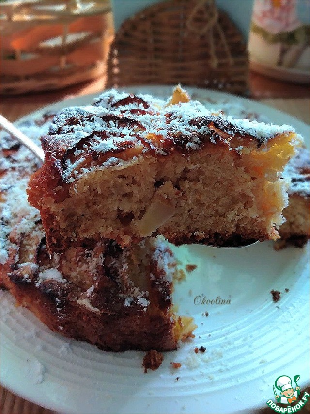 Очень душевный пирожок. Готовила ровно в 2 раза поменьше в форме размером D-20 cм, но всё по рецепту. Сахар брала коричневый. Перед выпечкой присыпала пудрой и корицей яблоки сверху. Готовый остывший пирог посыпала кокосовой стружкой и сахарной пудрой. Спасибо большое за замечательный рецепт!