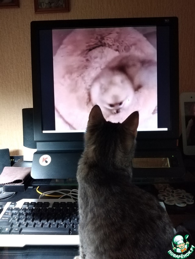 Это Кукся прыгнула ко мне за компьютер, а я рассматривала собачку в рекламе лежанок. А у Кукси такая есть. Вот её очень заинтересовал этот эпизод, кто же в её лежанке сидит? Смотрела не отрываясь!
