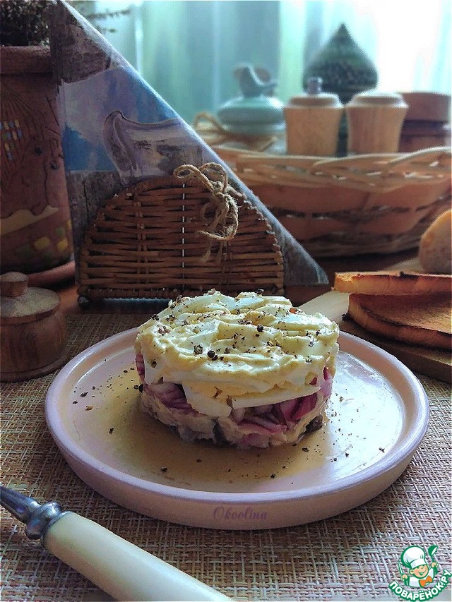Замечательный салат! Минимум ингредиентов, а вкус потрясающий. Я убавила количество ингредиентов вдвое и сделала салат на 2 порции индивидуально каждому. Вместо репчатого лука я использовала красный. Всё делала по рецепту! Спасибо большое за салатик, который всегда выручит в любом случае!