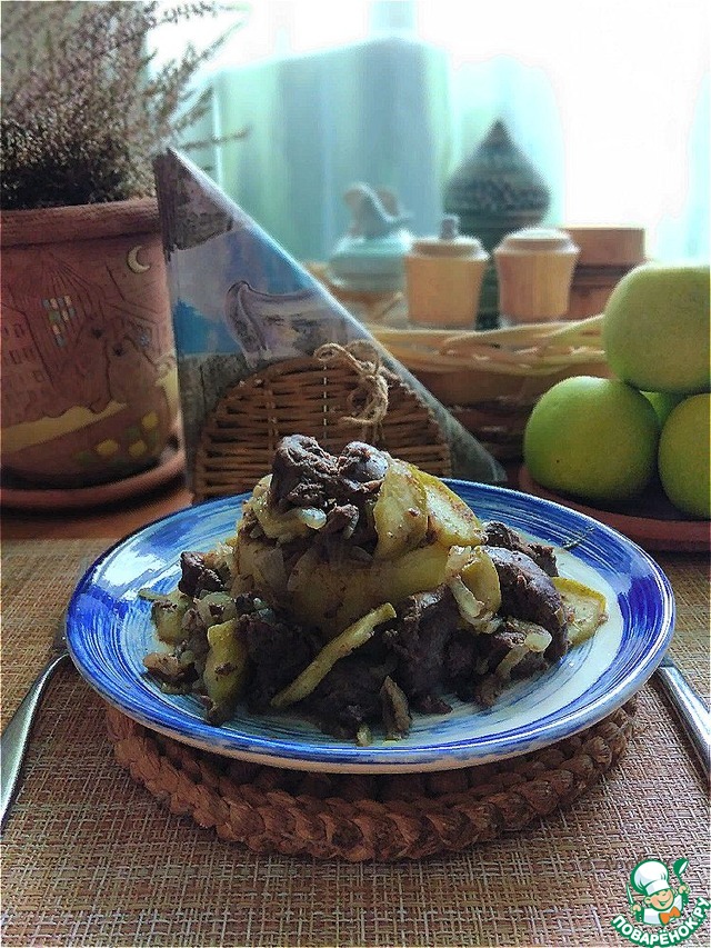 Здесь всё моё! Печень люблю в любом исполнение и готовлю часто. Вот с яблоком делала впервые. Делала всё по рецепту, уксус тоже добавляла. Подала с картофельным пюре! Душевно! Спасибо за рецепт!
