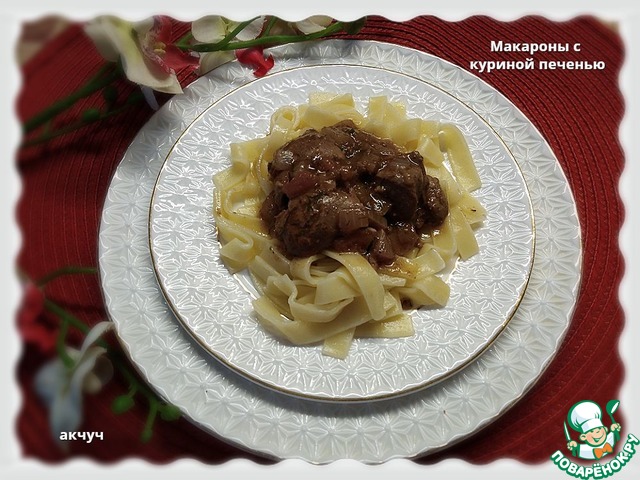 Я так понимаю, что главное здесь приготовление печенки. С нее и начала. Все делала по рецепту с небольшими отступлениями. Вместо пасты брала томатный соус, вместо петрушки укроп, лук белый, помидоры обычные. Получилось очень вкусно. Я не стала смешивать с макаронами, подвала отдельно.