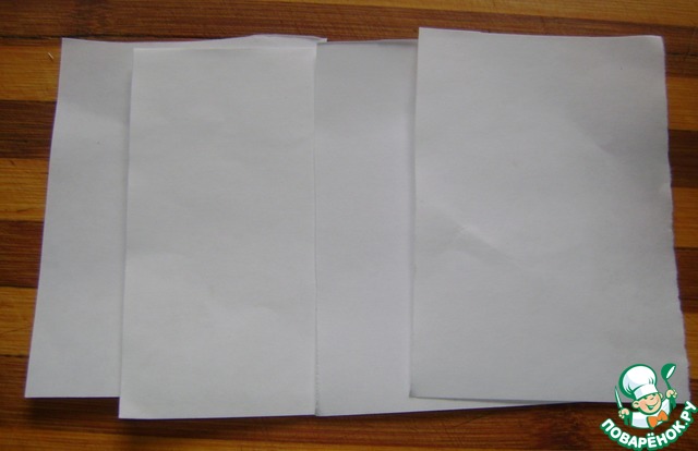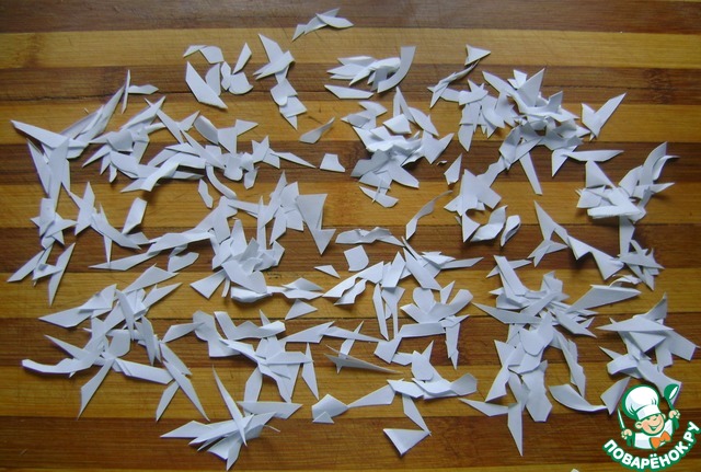 А если попроще, то нарезать прямоугольники на полоски где-то по 1 см, а затем на мелкие кусочки. Мне понравился первый вариант.
