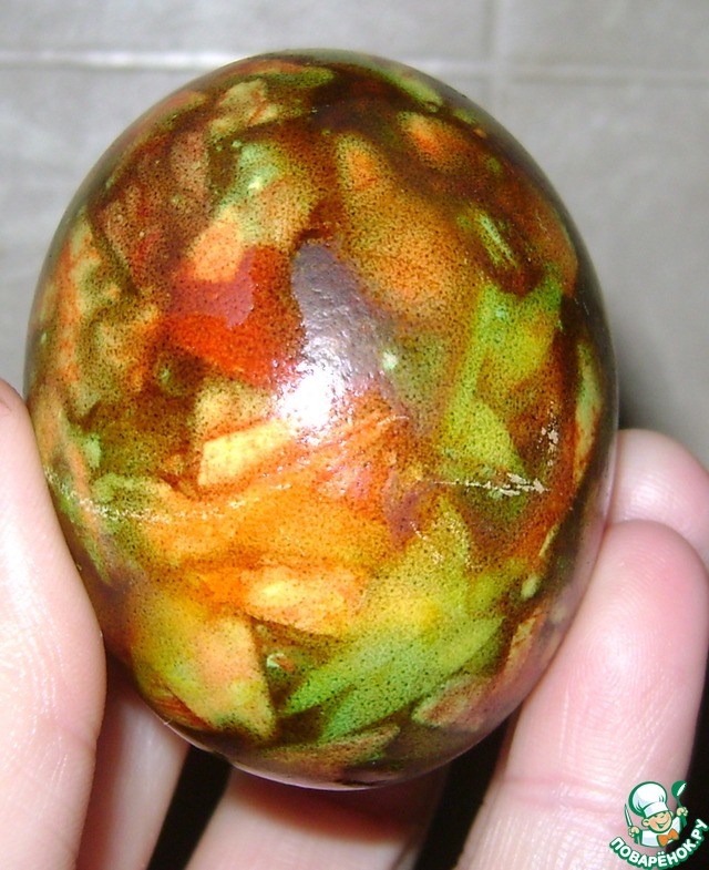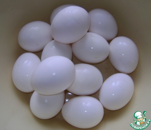 Скажу честно, что белок очищенных яиц у меня немножко окрасился. На вкус это не повлияло. Причины не знаю, скорей всего она в длительном нахождении яиц в отваре после варки. Меня это не смутило, т.к. краситель пищевой.