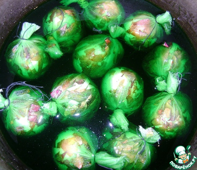 По истечении указанного времени выключить огонь и оставить яйца до полного остывания. Так случилось, что яйца у меня пролежали в отваре часа 4. Получились более тёмными, чем у автора. Мне кажется, что будет достаточно 30-60 мин. Одеть перчатки, очистить от марли и шелухи, вымыть, высушить и натереть подсолнечным маслом для блеска.