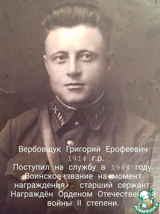 Отец моего мужа Вербовщук Григорий Ерофеевич не был моряком. Он был пехотным офицером. Его награды хранятся в нашей семье по сей день. Сейчас, глядя на его фотографию, я понимаю, что во время войны ему было меньше лет, чем сейчас моему сыну. И мне делается горько и страшно, что такие молодые ребята должны были пройти ад войны.