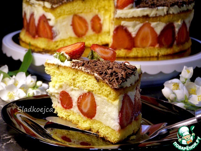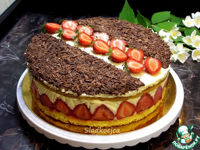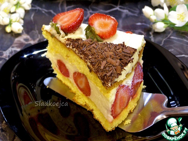 Торт получился очень нежный и, конечно, очень вкусный. Вариантов исполнения у него может быть много: его делают и с клубникой, и с персиками, и с киви… Верх тоже оформляют по-разному, да и крем используют не только классический Патисьер, как в этом рецепте… Я решила поэкспериментировать, но не потому, что рецепт не понравился. Просто я люблю эксперименты! Из изменений: в крем добавила белый шоколад и коньяк, пропитку сделала другую (сок + клубничный сироп + ликер). Готовила в форме 24 см, для крема брала 400 мл молока и остальное пропорционально.