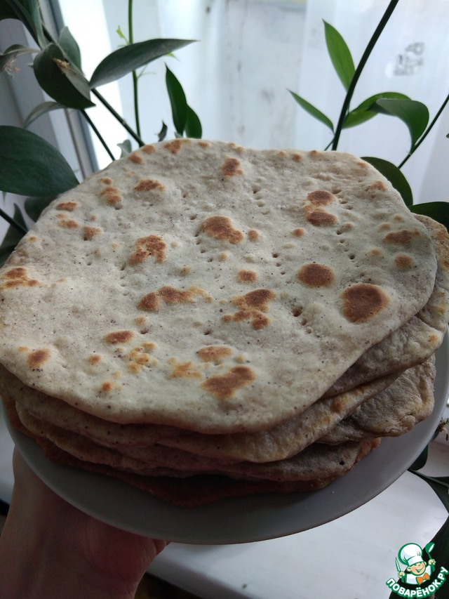 Очень вкусные лепешки. Сахар не добавляла, использовала разрыхлитель, добавила столовую ложку муки из виноградных семечек. Раскатывала тонко, жарила на сухой сковороде.