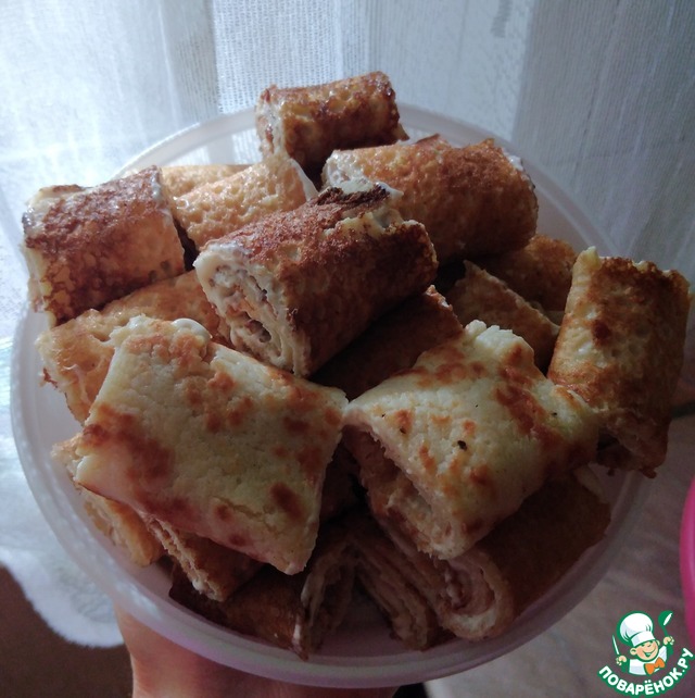 Очень вкусные блины получились. Я часть смазала плавленым сыром и сделала рулетики.
