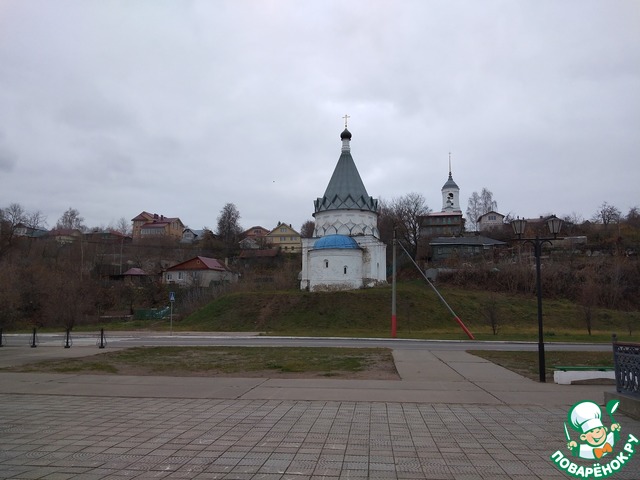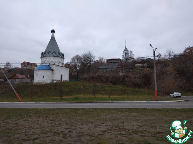 Вдалеке видна Николо-Набережная церковь. Николо-Набережная церковь - образец переходного стиля между древнерусским (московским) барокко и барокко европейского склада расположена на террасе окского берега, на одной из самых заселённых улиц Мережской слободы, идущей вдоль берега Оки, в которой проживали рыболовы, поставлявшие рыбу к царскому двору. Церковь освящена в честь Николая Чудотворца – спасителя утопающих, покровителя рыбаков, мореплавателей и всех путешественников, и по древней русской традиции построена возле воды. Жители города называют ее Храмом Николы Мокрого. Весной Ока разливается и заполняет всю широкую пойму, вода подступает к самому храму, поэтому муромцы говорят: «У Николы мокрые ноги».