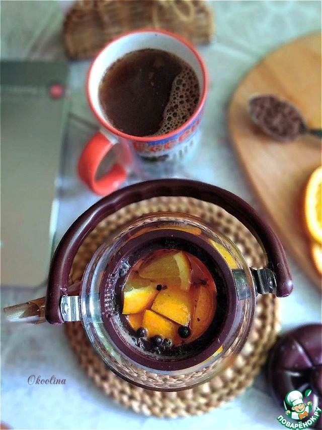Заварила я черный чай, изюм у меня из розового винограда, поэтому наверно у меня чай получился потемней. Цедру снимала специальным приспособлением, без белой кожицы. Ароматный вкусный душевный чай. Сок апельсиновый свежевыжатый наливала по вкусу. Спасибо тебе, дорогая, за такой интересный и вкусный чаёк! Буду заваривать обязательно в течении всех холодов.