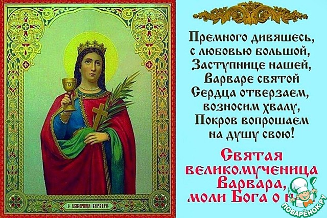 Дорогие мои Поварятки поздравляю Вас с Днем святой Варвары и пожелать хочу, чтобы дух великомученицы всегда наставлял Вас на верный путь и добрые поступки, чтобы жизнь дарила светлые моменты счастья и любви, чтобы сердце неизменно верило в чудеса и доброту этого мира.