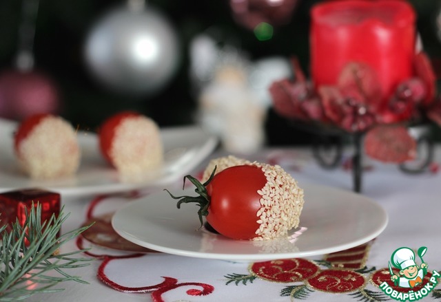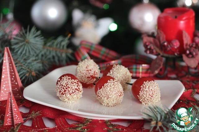 Воду вскипятить, всыпать сахар, проварить, добавить бальзамический уксус, перемешать. Черри окунуть в карамель и сразу в кунжут. Всё, закуска готова.