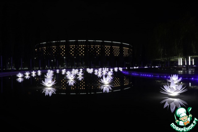 Светящиеся лотосы расположились в искусственном водоёме с деревянным покрытием и «водопадом». Точное количество цветков, думаю, знает только тот, кто их монтировал.