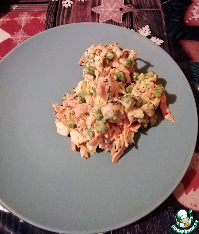 Вкусный салат. Горошек отварной из заморозки, в заправку добавила сметану.