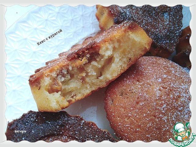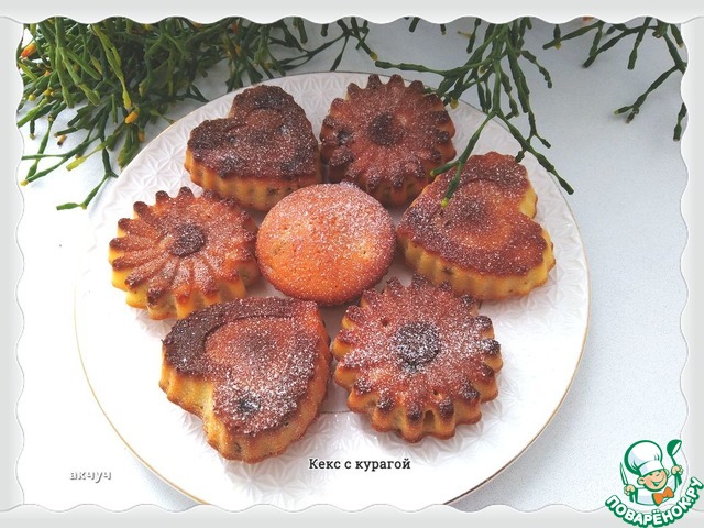 Готовила все точно по рецепту, но вместо кураги добавила изюм. Все взвешивала на весах: сахар 180 г, кефир 276 г, мука 200 г, изюм 74 г. Выпекала 35 минут при 180 градусах в порционных формочках. Тесто не очень сильно выросло в размере. Получились вкусные, немного плотные кексики.