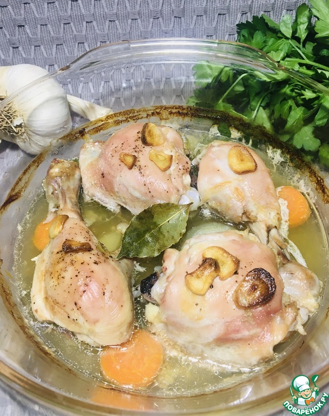 У меня два бёдрышка и две голени(кожу я сняла полностью)которые я уложила на кольца лука и морковки.сверху положила чесночёк.Соль и перец не использовала.запекала час.Получилось очень вкусно.