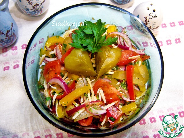 Вкусный пикантный салатик, с добавкой маринованного огурца и сыра. Такое сочетание овощей я люблю, а вот сыр в такой салат добавила впервые.