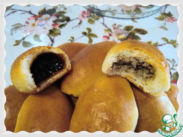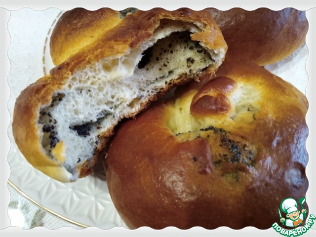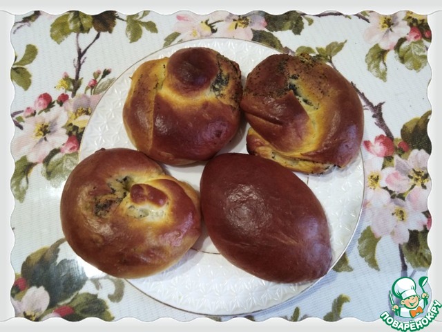 Готовила точно по рецепту. Муки ушло 500 г. Из отступлений: верх смазывала смесью сливок и молока. Выпекала 15 минут при 180 градусах. Начинка была готовая, ее чуть не хватило, пришлось слепить пару пирожков с повидлом. Получилось очень вкусно и с маком и с повидлом.