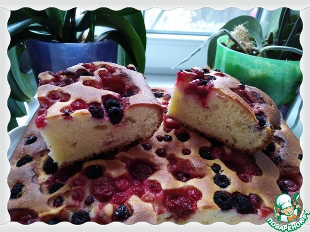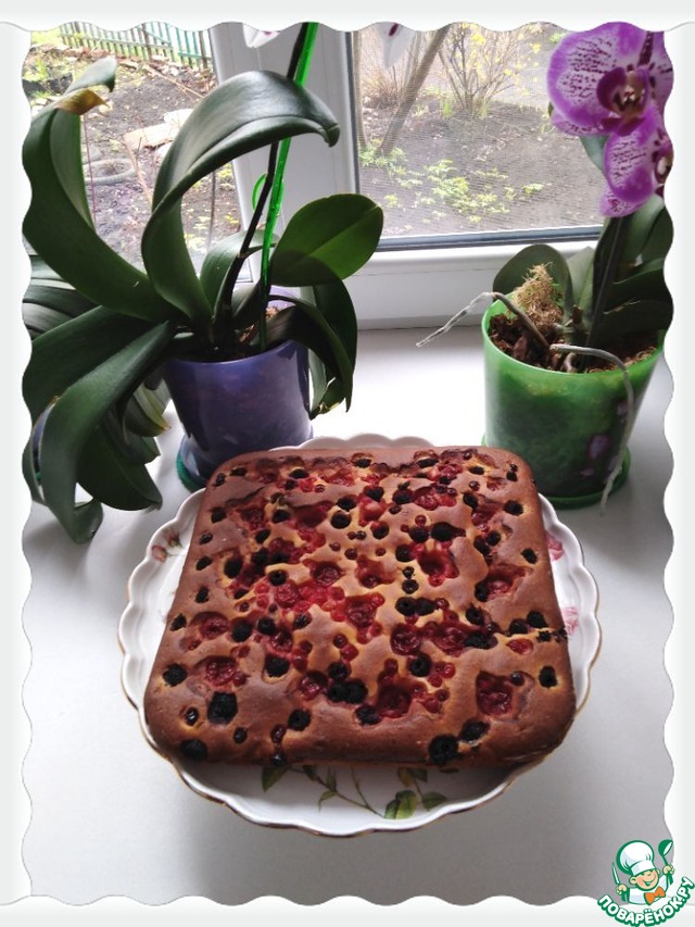 Пекла пирог с вышней, красной смородиной и с еще какой-то (название не знаю). Выпекала 45 минут при 180 градусах. Получился вкусный пирожок, мягонький, в меру сладкий. Сверху ничем не посыпала. В следующий раз посыплю хорошенько пудрой для сладости.