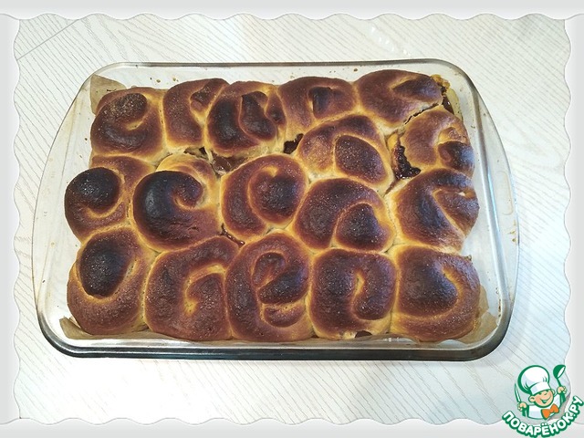 В выходные дни стараюсь побаловать своих вкусненьким. Вот и воспользовалась рецептом. Муки ушло 670 г, масло брала обычное, вместо джема яблочное повидло и обошлась без орехов. Тесто очень приятное в работе. Хорошо выросло. Пекла 25 минут, очень хорошо зарумянились, пришлось прикрыть верх фольгой и еще 5 минут подержать в духовке. Получились вкусные нарядные булочки. Фото получилось слишком темным, на самом деле булочки аппетитного румяного цвета.
