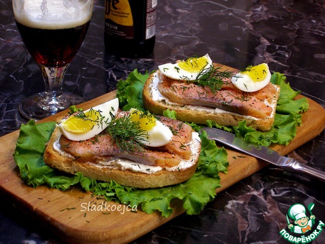 Очень вкусно, отличная брускетта! У меня с малосольной семгой и без каперсов. Хлеб обжаривала без масла, яйцо варила 4 минуты. Готовила на ужин – с темным пивом очень вкусно! Муж оценил