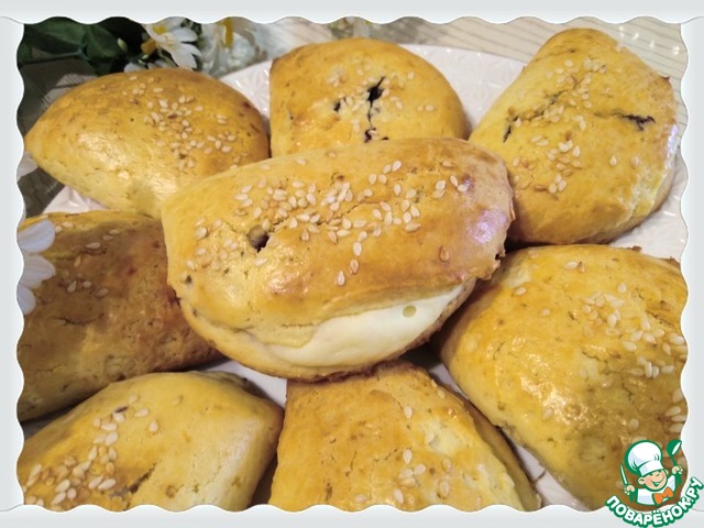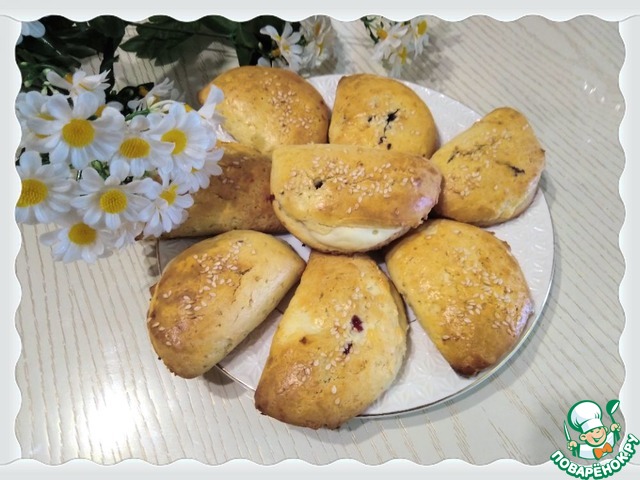 Готовила точно по рецепту, но верх смазывала сливками и посыпала кунжутом. Вместо красной смородины добавила несколько ягод смородины из варенья. Тесто получилось приятное мягкое, после проведенного времени в холодильнике таким и осталось. Так что пришлось перед раскаткой припудрить стол мукой. Все неровности формовки во время выпечки сгладились. Выпекала 25 минут при 180 градусах. Получились вкусные сочники. Количество крема как раз хватило на всю выпечку.