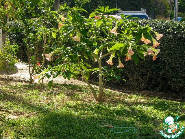 Бругмансию в народе еще называют «ангельской трубой», либо «золотым дурманом». Это связано с тем, что во время цветения на растении формируются необычные цветки внешне похожие на граммофончики.
