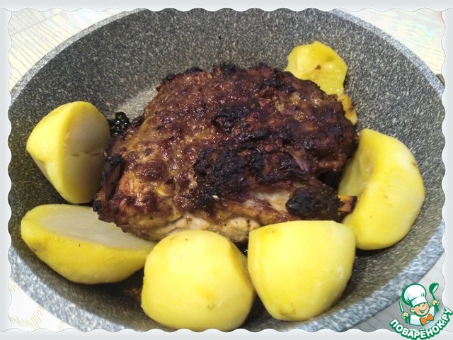 Вместо лимонного сока по совету автора использовала бальзамический уксус, слегка увеличила количество чеснока и добавила сухую аджику. Запекала одним куском 1 час при 200 градусах, потом добавила готовую вареную картошку и еще минут 10. Получилось очень вкусно! Забираю рецепт в любимчики!