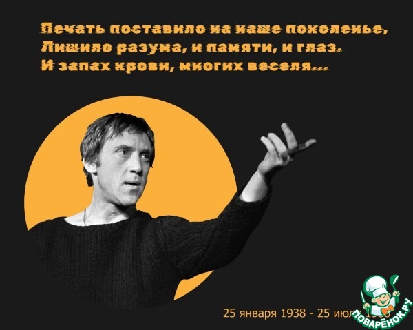 Мы вчера помянули Владимира Семёныча ( и вспоминали как раз, Алекс, тебя- ждали этот пост)!А тогда, в 80-м , я не сразу узнала о его кончине- были в студенческом стройотряде в деревне без средств коммуникаций, позже кто-то из друзей приехал в гости и сказал, уже после похорон через пару недель...
