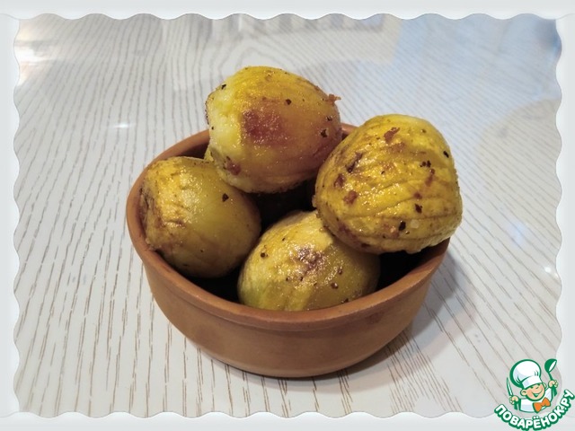 Приготовила на ужин. Картошка старая, да и не нравится нам со шкурками готовить, поэтому просто почистила и нанесла рисунок вилкой. Я так думаю, что данный рисунок только для красоты и никакой другой функции не несет. Но именно это и привело к рецепту. Картошечка получилась вкусная. Главное, подобрать соответствующий размер. У меня было как раз 10 небольших картофелин, которые отлично все улеглись на дно толстостенной кастрюли. В общем, повторять буду.