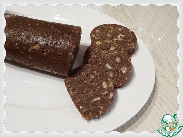Готовила точно по рецепту. Орехи брала грецкие и еще добавила арахис. Делать было очень просто. Боялась, что печенью не хватит влаги, но нет, оно отлично соединилось с горячей смесью в единое целое. Пока раскладывала на пленку, боялась, что все сама съем. Ну таааак вкусно! Ночь колбаска охлаждалась в холодильнике, утром сняла пленку и нарезала. Очень вкусно!