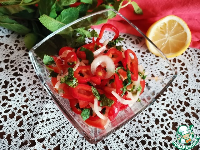 Уже знакомый салат, но с добавлением сладкого перца, который отлично вписался в компанию мяты, помидора и лимона. Сочно, вкусно, ароматно. Щепотка жгучего перца придаёт чуть другой настрой.