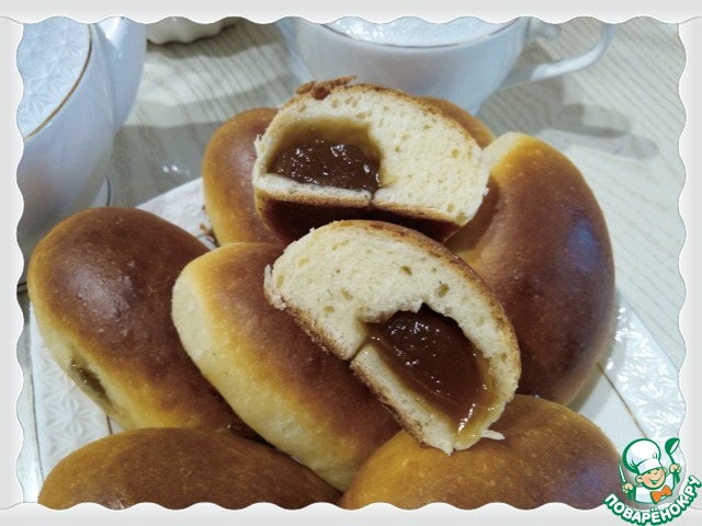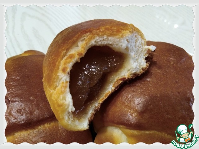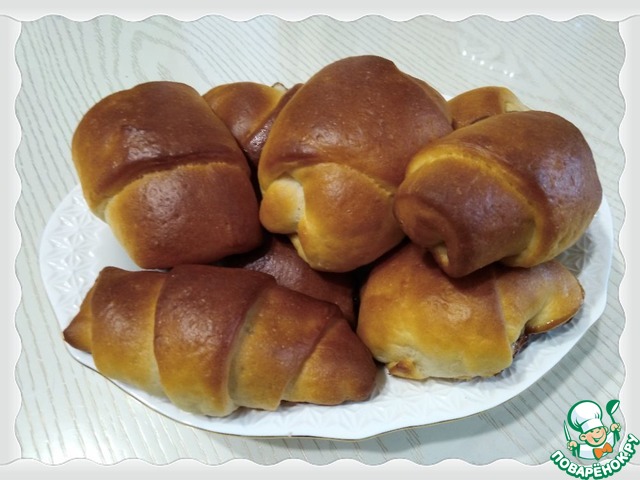 Так как мое семейство признает начинку только из яблочного повидла, то, естественно, я воспользовалась лишь рецептом теста. Муки ушло 290 г, остальное по рецепту. Получилось 27 штук. Часть начинки была жидковата, поэтому подворачивала края рогаликов, чтобы она не вытекла. Остальные не надо было подворачивать, так как повидло густое покупное. Верх смазала молоком, пекла 25 минут при 180 градусах. Ну что сказать? Конечно, получилось вкусно!!!