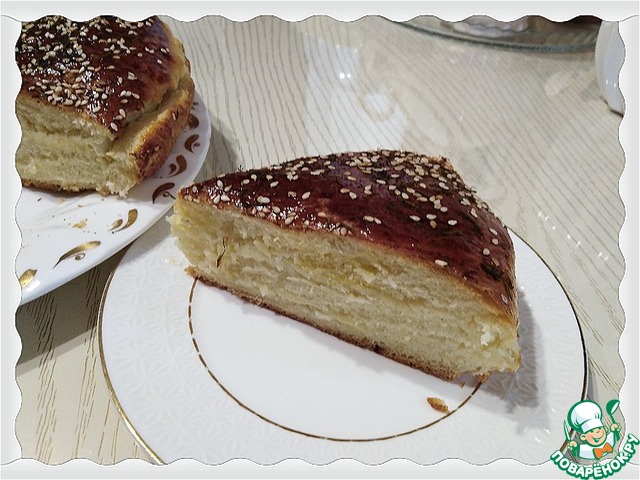 Ну вот и я испекла пирожок. Муки ушло на 30 г меньше, а вот сыра чуть больше. Я не стала перекручивать тесто, а просто сверху порезала, хотя в готовом виде этого не видно. Пекла 20 минут при 180 градусах, потом прикрыла фольгой и еще 10 минут допекала. Пирожок получился замечательным, румяным, мягоньким и очень вкусным. Нам и гостям очень понравился!